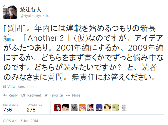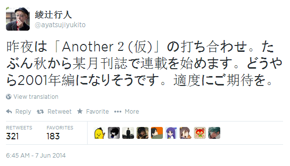 Acho que as pessoas que assistiram o anime antes e/ou os que leram o mangá estão na espera de mais informações assim como nós. O autor de Another, Ayatsuji Yukito, twittou no último dia 05 de Junho que ele pretende começar uma nova história ainda esse ano e que possivelmente será chamada “Another 2″.