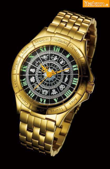 Este acessório espetacular tem ao seu centro os símbolos dos 12 Cavaleiros de Ouro, onde estão guiados por 12 números romanos que brilham no escuro representando as horas e os nomes dos signos escupidos no arco superior em latim. A pulseira, assim como a parte central do relógio é feita inteiramente de aço banhado a ouro.