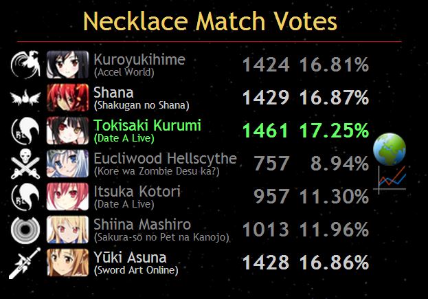 Na votação direta, quase todas as personagens ficaram empatadas, sendo que Kurumi Tokisaki foi a que recebeu o maior número de votos, 1461 correspondendo à 17,25% do total. A segunda mais votada foi Shana com 1429 votos correspondendo à 16,87%. Em terceiro ficou Asuna com apenas um voto a menos, 1428 correspondendo à 16,86%. Com 4 votos a menos que Asuna ficou Kuroyukihime, ficando com 1424 votos ao seu favor correspondendo 16,81%.