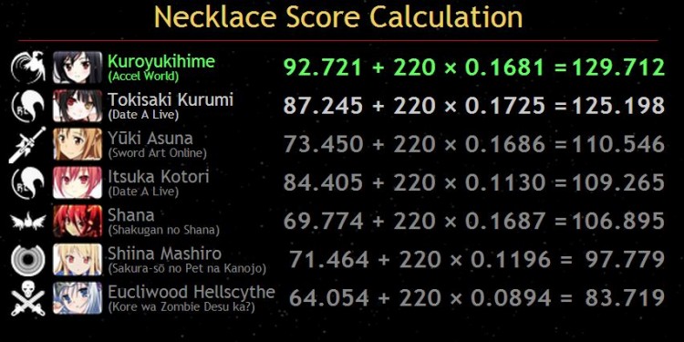 Mesmo sendo apenas a 4ª mais votada da disputa, Kuroyukihime venceu o Colar na soma de pontos graças a formula do SDO (Saldo de votos ao seu favor durante o período em disputa). Segundo informações do AMVeSaimoe, O calculo da formula é o Saldo da fase classificatória, mais 220 multiplicado pela porcentagem de votos conquistado no jogo do colar. Com isso a personagem de Accel World ficou com o título somando 129.712 pontos, deixando Kurumi com 125.198 pontos e novamente com o segundo lugar numa final de período (ela já havia ficado em 2º lugar no Período Ametista). Em 3º lugar ficou Asuna Yuuki que havia vencido o este mesmo período em 2013, com 110.546 pontos.