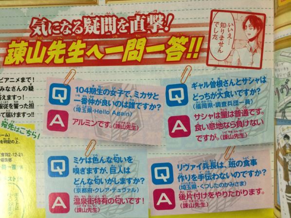 As vezes, sarcasmos e brincadeiras são levadas muito a sério pelas pessoas e mais um recente exemplo disso na vida real é o que foi publicado na sessão Q e A (uma sessão de entrevistas) da Bessatsu Shounen Magazine e o criador Hajime Isayama de Shingeki no Kyojin (Attack on Titan) respondeu uma pergunta que deixou uma resposta em aberto.
