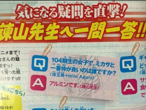 A revista perguntou ao criador do mangá “Qual é o membro feminino do 104th Trainee Regiment que Mikasa Ackerman é mais próxima?” E a resposta de Isayama foi impagável:
