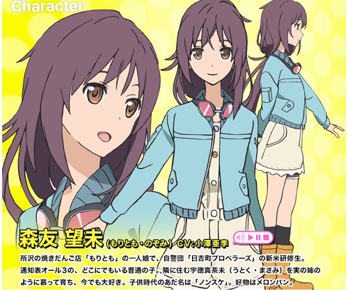 Ari Ozawa como Nozomi Moritomo, uma “garota normal” que ajuda no restaurante da familia “Moritomo”em Tokorozawa. Ela é uma nova recruta no grupo de vigilantes “Hiyoshi Town Propellers”. Ela ama sua vizinha Masami Utoku como uma irmã mais velha. Seu apelido de infância era “Nonsuke” e sua comida favorita é melonpan.