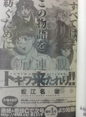 Também na revista Weekly Shonen Shogakukan deste domingo foi anunciando que o criador de Shijō Saikyō no Deshi Kenichi ou Kenichi Mightiest Disciple, Shun Matsuena irá lançar um mangá com o titulo de Tokiwa Kitareri na próxima edição. O primeiro capítulo terá capa colorida e será vendido no Japão a partir de 03 de dezembro.(Rapidinho né?)