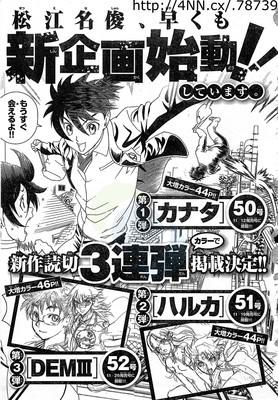 A revista também irá publicar um mangá de 46 páginas “DEM III“, o terceiro de três one-shots de Matsuena que foram lançado na revista, estes one-shots incluem páginas coloridas e o primeiro mangá de 44 páginas, “Kanata“, estreou na 50ª edição da revista em 12 de novembro. Foi lançado o segundo one-shot, “Haruka“, na edição de 51 em 19 de novembro. Todos eles são descritos como histórias escolares.(o Cara não para)