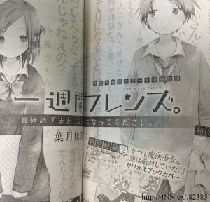 A edição de Janeiro da revista Gangan Joker da Square Enix anunciou nesta segunda-feira (22/12) que o mangá Isshuukan Friends (Uma Semana Amigos) da autora Matcha Hazuki, vai terminar na próxima edição da revista que será lançada no dia 22 de Janeiro.