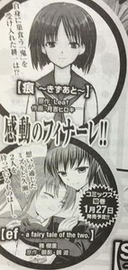 A edição de Fevereiro da Revista Dengeki Daioh da Kadokawa anunciou no último sábado que o mangá do autor Juri Miyabi, Ef: a fairy tale of the two, será encerrado na edição para Março com lançamento previsto para o próximo dia 27 de Janeiro. O mangá é adaptado da Visual-Novel de Minori.