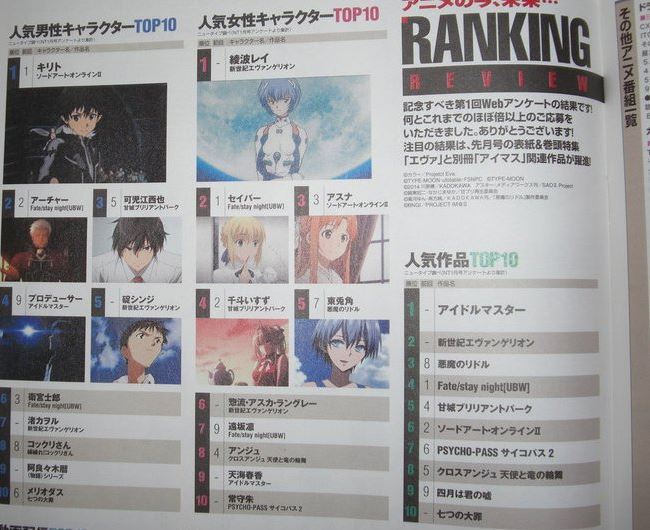 Pois é, Evangelion surgiu do nada e ficou em 2º lugar no ranking, deixando para trás favoritíssimos Fate/Stay Night e Sword Art Online. De quebra ainda colocou seus principais personagens nas duas outras listas, sendo que Rei Ayanami ficou em 1º no ranking feminino. Esta misteriosa aparição no ranking a frente de outras séries populares do momento pode ser considerada pelos lançamentos no Japão das versões remasterizadas da série em HD deste clássico anime mecha.