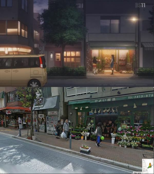 Claro que há diferenças notáveis nos cenários do anime e nas imagens enviadas pelos internautas, afinal o episódio 1 do anime se passa na primavera e o Japão neste momento está vivendo o inverno.