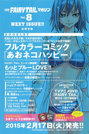 A sétima edição da Monthly Fairy da Kodansha anunciou nesta quinta-feira que Hiro Mashima irá desenhar um mangá one-shot intitulado “Aoneko Happy”(Happy o Gato Azul) na próxima edição da revista, que estará disponivel no Japão em 17 de fevereiro. Será um spinoff do mangá totalmente em cores e terá Happy como o personagem principal e em cores.