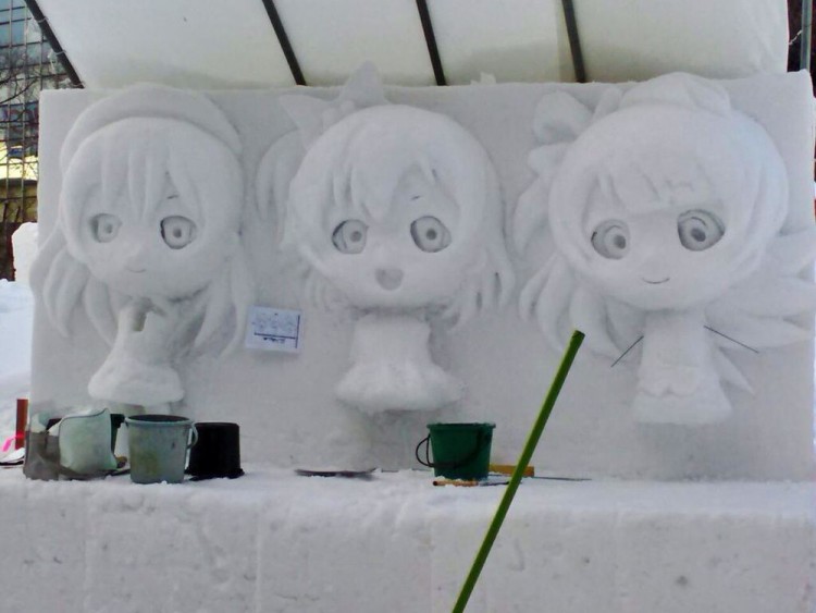 Porém, algo chamou a atenção dessa vez. Além de todos os anos que diversas estátuas de gelo serem construídas no local, neste ano teremos idols esculpidas de gelo também. Uma delas já é bem popular, que é a estatua de Hatsune Miku presente mais uma vez no festival. A outra é uma escultura em gelo das personagens Kotori, Honoka e Umi, da série de anime Love Live! School Idol Project: