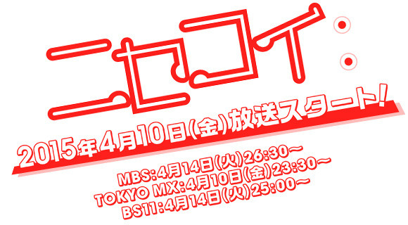Nisekoi estréia dia 10 de Abril, pela Tokyo MX e será retransmitido pela BS11 e MBS. O anime faz parte da Temporada de Primavera 2015.