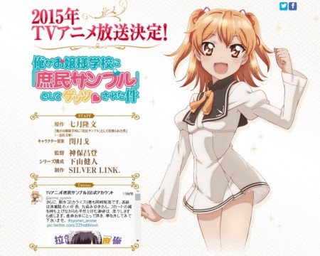 Foi divulgado neste fim de semana, durante o evento AnimeJapan 2015, realizado no Tokyo Big Sight na capital japonesa, o primeiro vídeo promocional para a adaptação em anime de TV Ore ga Ojō-sama Gakkō ni “Shomin Sample” Toshite Gets-rareta Ken (algo como “A história em que fui sequestrado por uma escola de Ladys novas para ser uma “amostra das pessoas comuns”), ou simplesmente Shomin Sample, baseado no mangá de Risumai. O vídeo revela que Hiromi Mizutami (Jigoku Shoujo, Toriko, Non Non Niyori) da Team-MAX está compondo as músicas para a série e Takao Sano está adaptando os personagens.