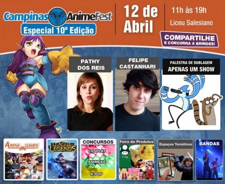 O 10º Campinas Anime Fest será realizado no dia 12 de Abril, no Colégio Liceu Nossa Senhora Auxiliadora, e irá reunir os amantes do Anime e Mangá, Histórias em Quadrinhos, Games, RPG, Card Games, Música, dentre outras temáticas vinculadas. O evento contará com mais de 20 atividades, dentre elas palestras, apresentações musiciais,, concursos de Cosplay (fantasias), concurso de Animekê (karaokê temático), torneios de vídeo-games, card games, feira de produtos, praça de alimentação, dentre muitas outras atividades.