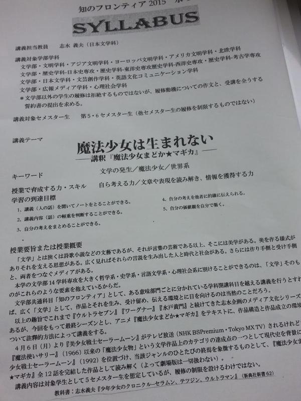 A classe lecionada pelo Professor Yoshio Shimizu, que realizou a palestra em aula do curso “Chi no Frontier” (algo como Conhecimento da fronteira) fez uma leitura dos 12 episódios da popular série em anime de fantasia sombria envolvendo garotas mágicas (Puella Magi Madoka Magika) e estudou sua natureza instigante.