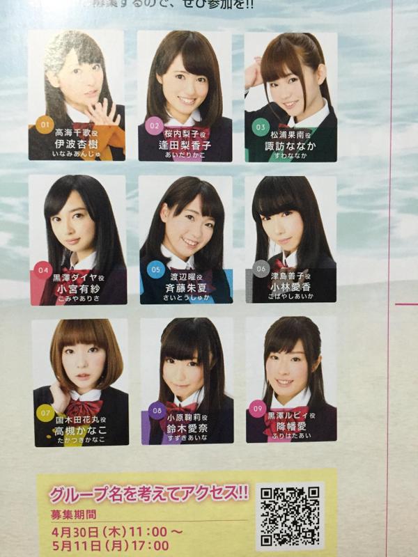 Com o final do projeto original Love Live! School Idol Project que deverá ser encerrado no próximo filme, intitulado “Love Live! School Idol Movie”, o pessoal da franquia já está trabalhando neste novo projeto e a edição de Junho 2015 da Revista Dengeki G estará anunciando o elenco escolhido para dar vozes as garotas de Love Live! Sunshine.