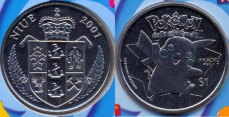 Em 2001, Niue, um departamento da Nova Zelândia, lançou uma moeda de um dólar comemorativa com a estampa deste famoso Pokémon, esta moeda pode ser usada normalmente e ela de um lado o Pikachu e do outro o brasão da nação neozelandesa. Com tanto tempo depois de seu lançemento, já imaginamos que ela não vale mais apenas um dolar.