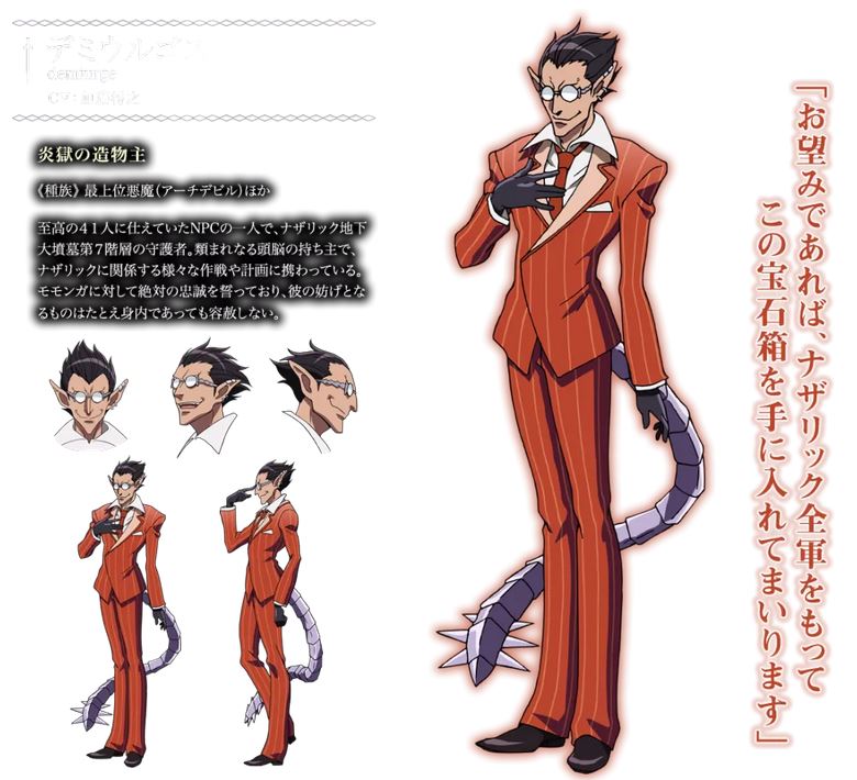 - Katou Masayuki (Kiyomasa Senji de Deadman Wonderland, Yoshio Kanzaki de Skull Man) como Demiurgo (Nível 5 arqui-diabo; Nível 10 Chaos)
