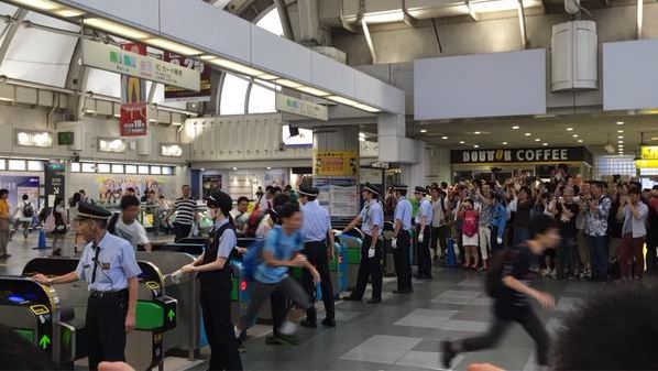 Como sempre, o tão aguardado primeiro dia de evento tem aquele tradicional corre-corre que começa desde a Estação Shimbashi e outras estações de trens próximas, até o local do evento. Abaixo, você vê a multidão do famoso “Day 1 Rush” desembarcando e passando pelas catracas da Estação Shimbashi: