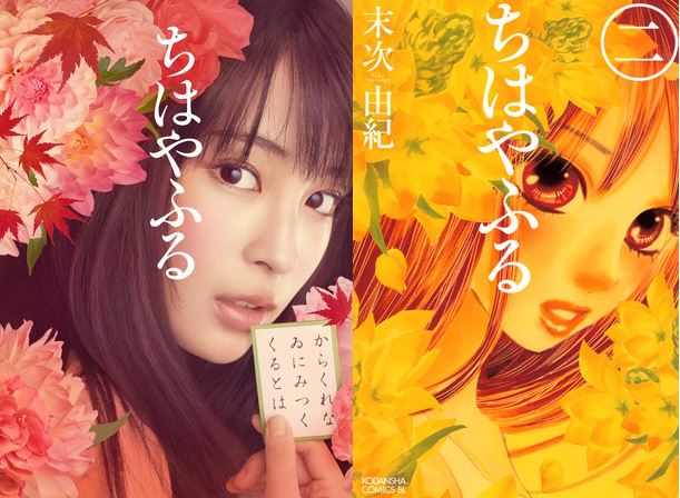Aqui, uma comparação da imagem do filme com a capa do Vol. 2 do mangá Chihayafuru:
