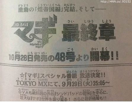 A revista vai também anunciar que Magi: The Labyrinth of Magic vai ter um espacial TV na Tokyo MX no dia 29 de Setembro, onde será discutido o mundo de Magi e as mais recentes informações sobre a franquia.
