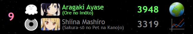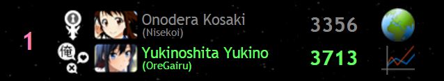 Com a vitória de Yukino sobre Onodera, a personagem de Oregairu tem a sua segunda conquista na ISML, sendo que a primeira foi conquistada este ano, com o titulo do Período Aquamarine. Com a conquista da Divisão Nova, ela entra para a galeria de vencedoras com este chart: