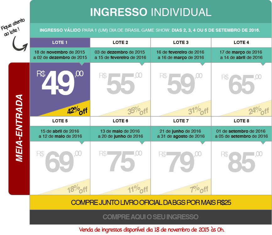 Fora da Black Friday, o primeiro lote de entradas para a BGS também pode ser adquirido pelo site do evento e com descontos que chegam a 48%. Até o dia 2 de dezembro, o ingresso individual para um dia de feira sai por R$49 (meia-entrada), e o passaporte, que dá direito a todos os dias de evento abertos ao público, por R$156 (meia-entrada). Além disso, opções combo, que incluem “Brasil Game Show – O livro”, que conta a história da BGS, custam a partir de R$74.