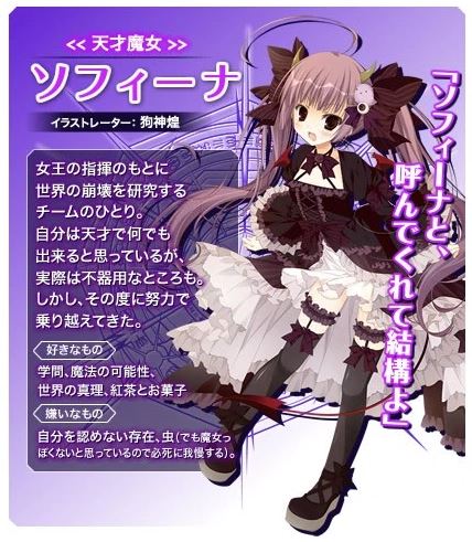 Mai Ishihara (Orange Pekoe de Girls und Panzer) como Sofina (a bruxa brilhante do mundo das trevas, Darkness Embraces; Ilustrador: Kira Inugami)