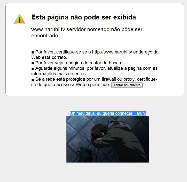 Algo inesperado começou a chamar a atenção de muitos Haruhistas espalhados pelo mundo. Ao entrarem no site oficial das séries de anime de TV de Suzumiya Haruhi, o haruhi.tv, as pessoas estão encontrando aquela tradicional “mensagem de erro”, afirmando que o site não pode ser encontrado no navegador e que você deve “tentar” outras maneiras de encontrar o site como o uso de um motor de busca na web para encontrar o que você está procurando (acontece muito quando você usa o 3G no Brasil).