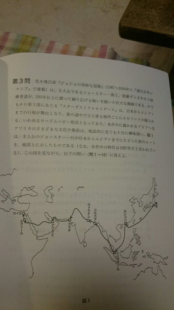 “Jojo’s Bizarre Adventure (1987-2004, Weekly Shonen Jump), de Hirohiko Araki, é um extenso mangá que lida com a luta de mais de duzentos anos de heróis, a família Joestar e seu arquiinimigo, Dio. A Parte 3 da série, Stardust Crusaders, é sobre a viagem dos protagonistas do Japão para o Egito e os eventos que ocorrem ao longo do caminho. Toma a forma de um filme de estrada e, do ponto de vista geográfico, é interessante ver como as diferentes culturas e costumes são representados Ásia e Norte da África. A Figura 1 mostra o caminho que o grupo Joestar do Japão para o Egito (a história se passa em 1987). Respondeu 1-10 perguntas usando essa figura. Responda as perguntas 1 – 10 usando esta figura:”