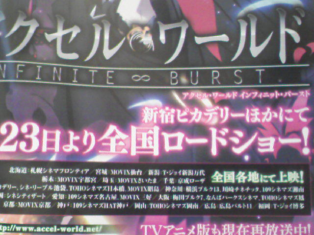 Em um recente scan da Dengeki Bunko Magazine, foi revelado que Accel World: Infinite Burst, sequência da série de light-novels e anime de TV Accel World, de Reki Kawahara, será mesmo um filme em anime e tem data marcada para sua estreia: 23 de Julho de 2016 em 24 cinemas do Japão.