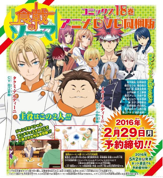 A Amazon Japan revelou nesta segunda-feira (08/02) que o mangá Shokugeki no Souma (Food Wars), de Yuto Tsukuda e Shun Saeki, vai virá acompanhado de um OAD em 04 de Julho de 2016. No entanto, ainda não foram revelados quaisquer detalhes sobre a história.