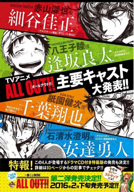 O site oficial da adaptação em anime de TV All Out!!, baseado no mangá de Shiori Amase, revelou informações da série como os primeiros nomes no elenco, staff e temporada de estréia.