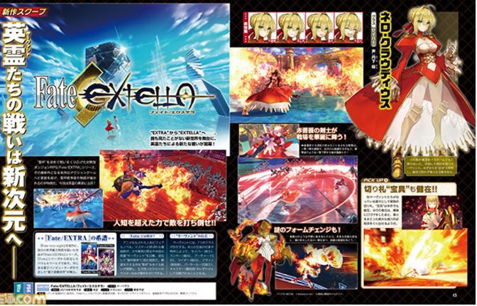 Segundo informações reveladas, a Weekly Famitsu da Kadokawa publicará 4 páginas sobre a transição da franquia Fate para o gênero de jogos de ação. Estas contará com mensagens dos criadores originais de Fate, Kinoko Nasu e Takashi Takeuchi. Também será mostrada a personagem da classe Saber, Nero Claudius (voz de Sakura Tange) e brincam que a batalha de servos entra numa nova dimensão… depois de Fate/Extra.