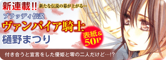 O anúncio acima lê: “Novo serialização!! A cortina sobe em uma nova lenda sangrenta! Vampire Knight por Matsuri Hino” e descreve a nova série da seguinte forma: “Yuki e Zero fizeram sua declaração de estarem juntos, mas…!?”