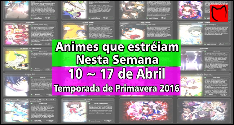 A Temporada de Primavera 2016 já começou e o Anime Xis trás para você o que entra no ar nesta semana de 10 à 17 de Abril. Alguns já estrearam e outros estão ainda por vir. Pegue sua agendinha, seu bloco de notas, sua conta na MyAnimeList e confira conosco os Animes que estreiam nesta semana.
