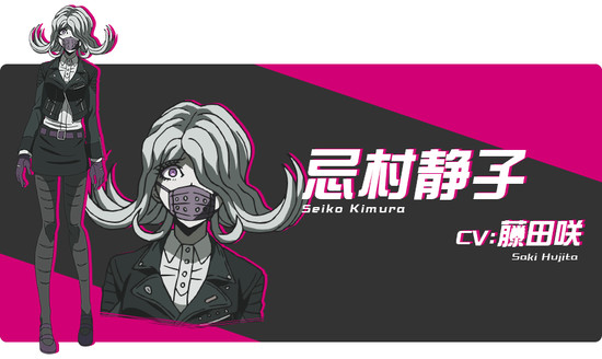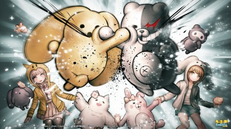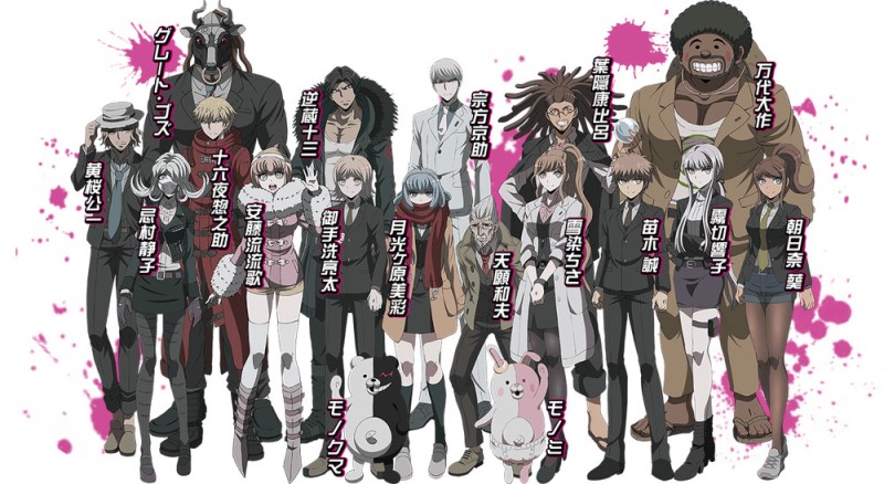 (Da esquerda para a direita) Kōichi Kizakura, Seiko Kimura, Great Gozu, Sonosuke Izayoi, Ruruka Andō, Juzo Sakakura, Ryota Mitarai, Monokuma, Miaya Gekkōgahara, Kyosuke Munakata, Kazuo Tengan, Monomi, Chisa Yukizome, Yasuhiro Hagakure, Makoto Naegi Kyōko Kirigi, Daisaku Bandai eAoi Asahina.