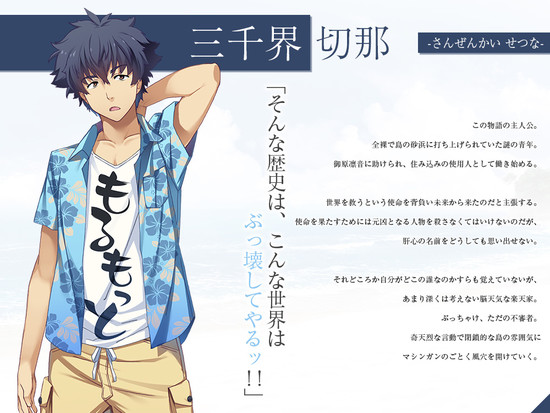 Setsuna Sanzenkai, o protagonista da série, um jovem que aparece nu nas praias da ilha. Rinne o resgata e começa a viver na casa da família Ohara como seu servo. Ele afirma que veio do futuro para salvar o mundo, mas é incapaz de se lembrar quem o enviou nesta missão. Otimista e sempre confiável, dedica-se a destruir as tradições da ilha um após o outro.