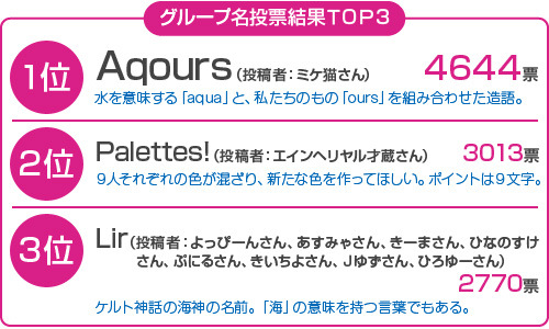 a Dengeki G realizou uma votação entre os fãs para nomear o nome do novo grupo de idols da franquia Love Live! Nesta, o nome escolhido foi Aqours: