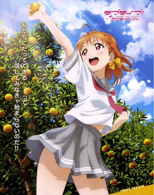 Anju Inami (Ino Yamanaka na peça teatral de Naruto) será a voz de Chika Takami, uma estudante do 2 ano do ensino médio, caçula de três irmãs e fãs das μ’s. Sua família tem uma pousada, que possui um banho ao ar livre com vista para o mar. É a lider do novo grupo de idols.