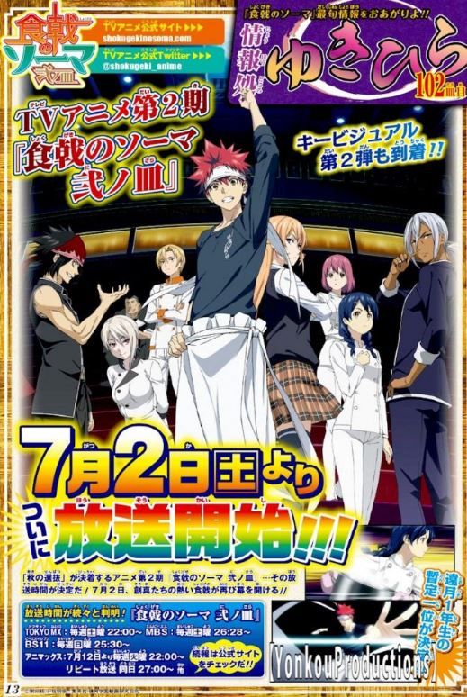 Em uma nova imagem promocional divulgada para a 2ª temporada do anime Food Wars: Shokugeki no Souma, foi revelada a data de estréia da adaptação em anime de TV.