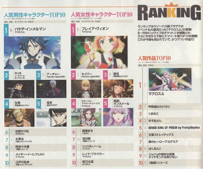 Macross Delta foi a série que eu citei acima que dominou o ranking da NewType, não apenas com o 1º lugar no ranking de animes, mas também com um personagem liderando o ranking masculino e com quatro no ranking feminino. Embora a série não tenha uma grande legião de fãs aqui no Brasil, lá no Japão, pelo menos ela é resultado de grande sucesso e, se pensarmos da franquia em geral, podemos ver que Sheryl Nome de Macross Frontier também entrou no ranking.