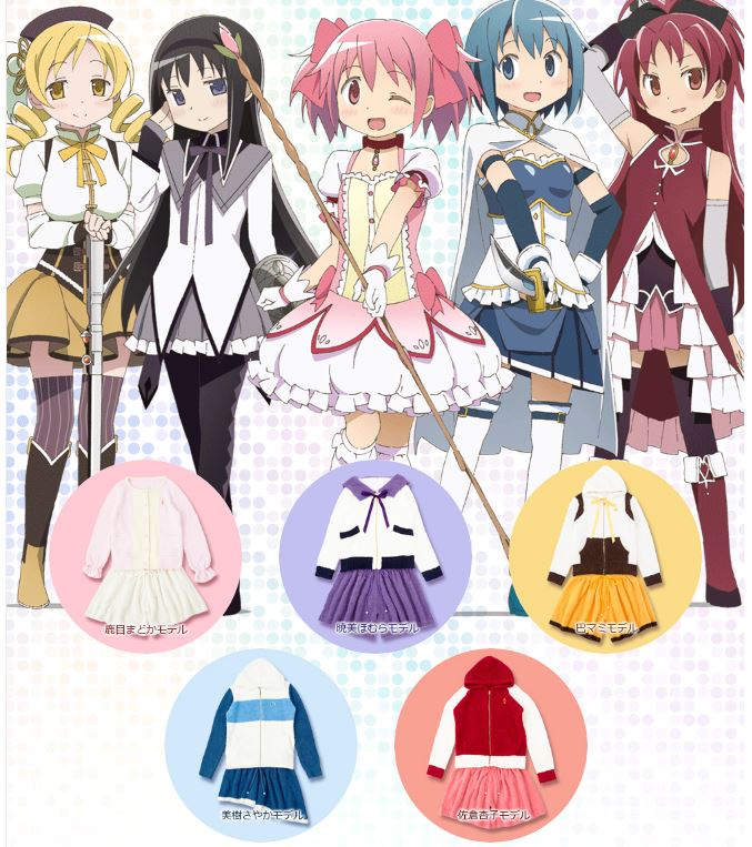 O site de roupas otaku Super Groupies anunciou uma nova linha de blusas de frio inspiradas nas personagens da série Puella Magi Madoka Mágica. Anteriormente, apenas a roupa da Homura Akemi havia sido lançada e agora a empresa lançou as roupas das outras quatro personagens Madoka Kaname, Mami Tomoe, Sayaka Miki, e Kyōko Sakura.