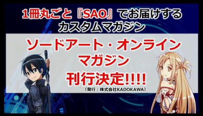 Em uma outra informação divulgada nesta segunda-feira, durante o “Sword Art Online Official Special Broadcast” transmitido pelo NicoNico, foi revelado que a Kadokawa vai começar a lançar uma revista da série Sword Art Online que vai incluir uma adaptação para manga do jogo Sword Art Online: Hollow Realization. O primeiro volume da revista será lançado no final de Outubro.