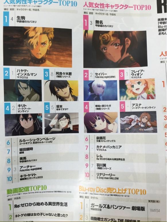 Enquanto os personagens de Macross Delta se mantiveram fortes desde o ranking passado, eles acabaram sendo destronados dessa vez pelos Kabaneris nesta edição da revista.