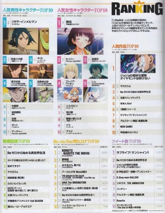 Já no ranking dos animes, Jojo’s Bizarre Adventure ficou em 1º lugar, seguido de Macross Delta e Re:Zero. Além disso, além das franquias Monogatari que está com sua sequências de filmes prequel sendo lançados no Japão e Love Live! que está com uma nova série no ar, temos a presença de boas séries da atual Temporada de Verão que estão no ar como Amanchu!, Arslan Senki e New Game!