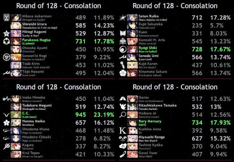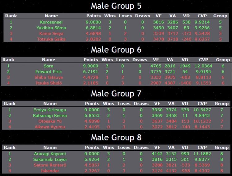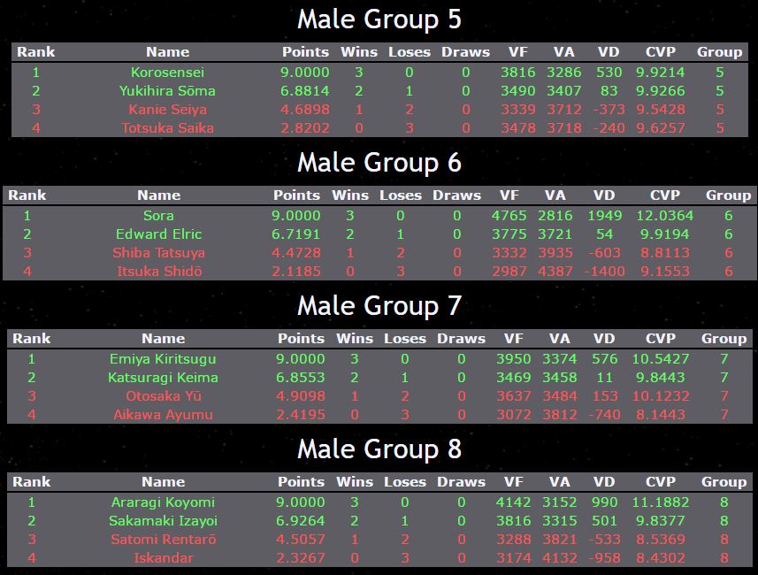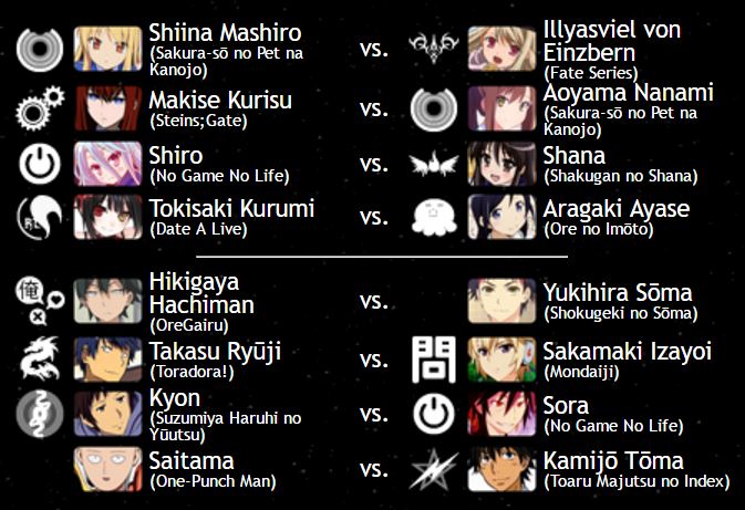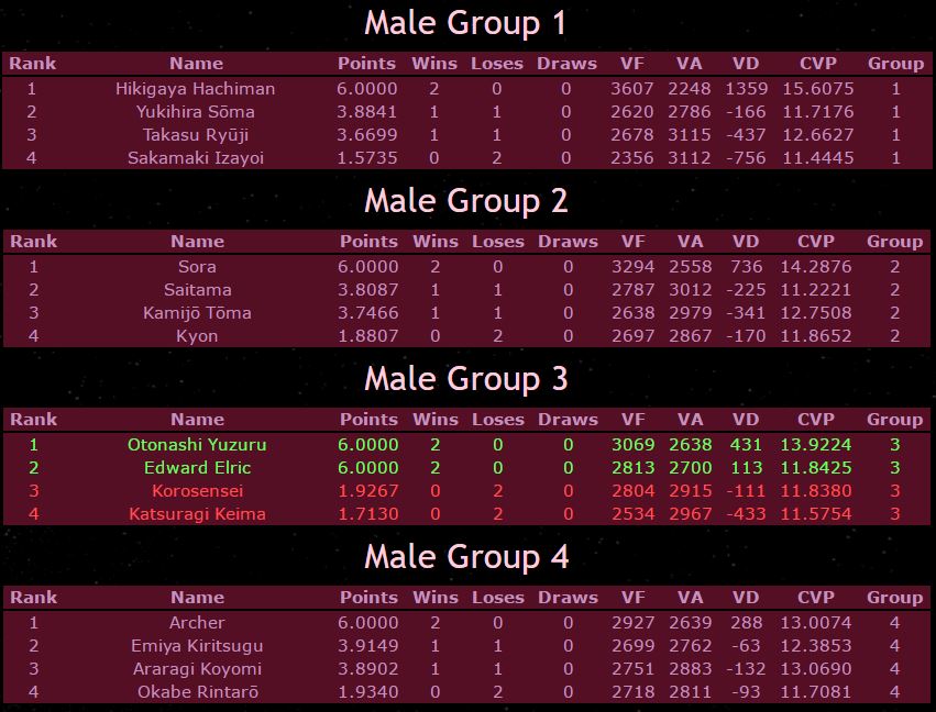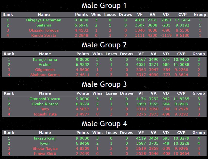 OBS: Assim como a divisão feminina, os personagens Hachiman, Otonashi, Koro-Sensei, Sora e Araragi já venceram jogos do pingente anteriores, por tanto, suas vagas foram passadas para os melhores segundos colocados no geral.