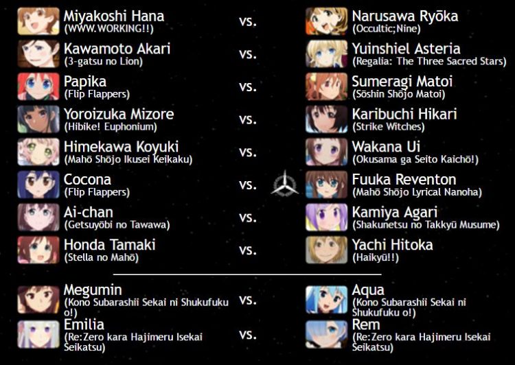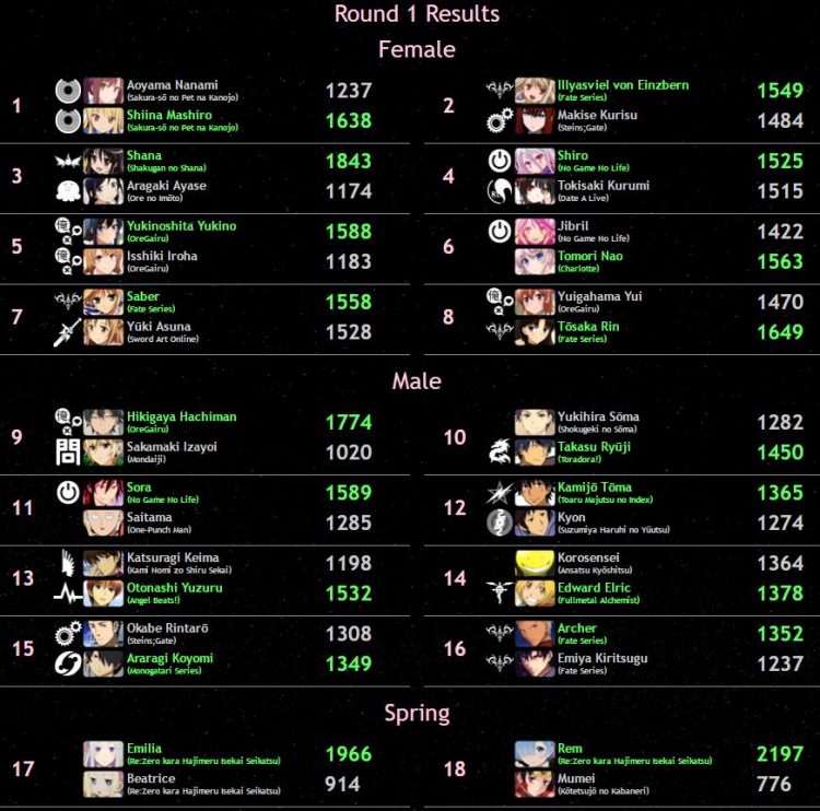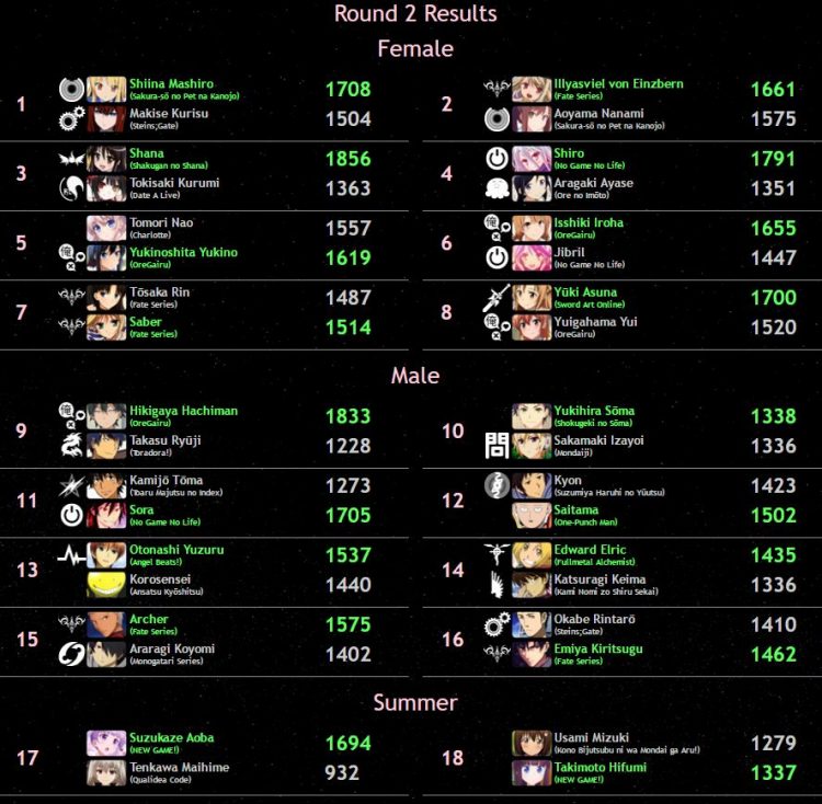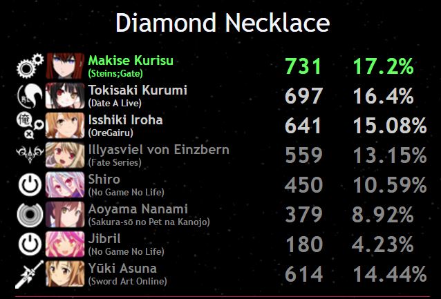 Chegaram para o jogo do Colar as 8 personagens de melhor campanha no geral: Kurisu Makise (Steins;Gate), Kurumi Tokisaki (Date A Live), Iroha Isshiki (Oregairu), Illyasviel (Fate Series), Shiro (No Game No Life), Nanami Aoyama (Sakura-sou), Jibril (No Game No Life) e Asuna (Sword Art Online).