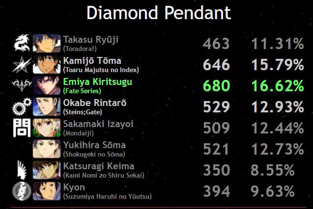 No confronto do Pingente, temos novamente vitória de personagem de Fate Series (isso porque até este ano nenhum personagem da série havia ganho nada). Kiritsugu foi o mais votado com 680 votos ao seu favor, sendo 16,62% do total de votos. Touma ficou em segundo lugar com 646 votos e em terceiro ficou Rintaro com 529 votos.