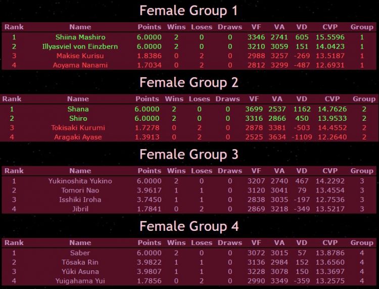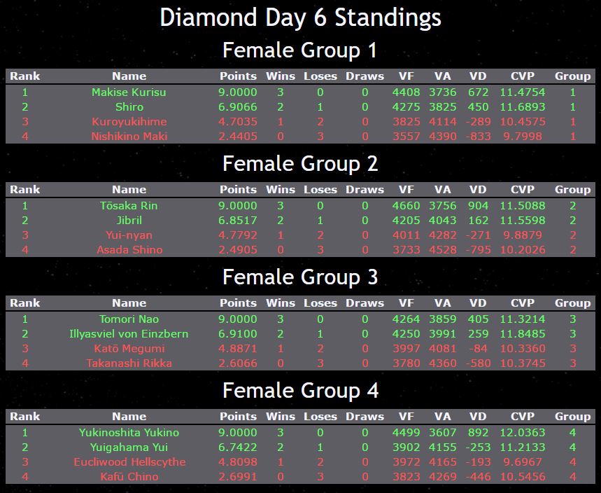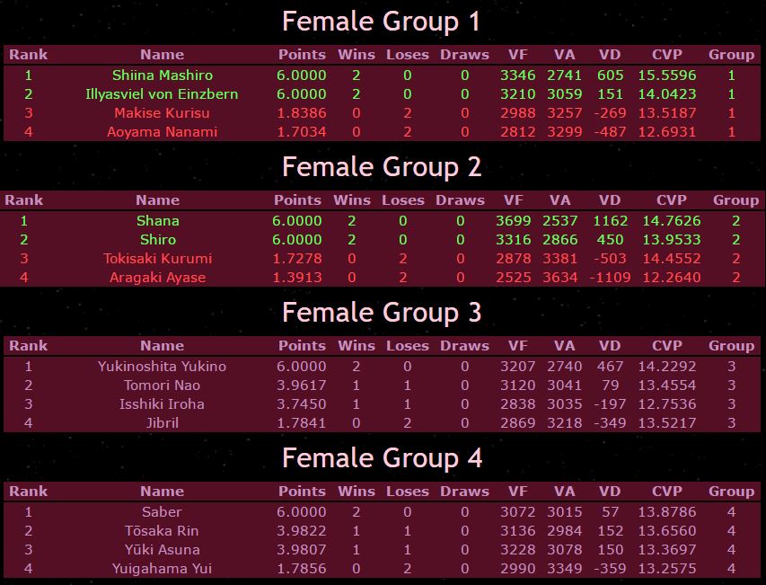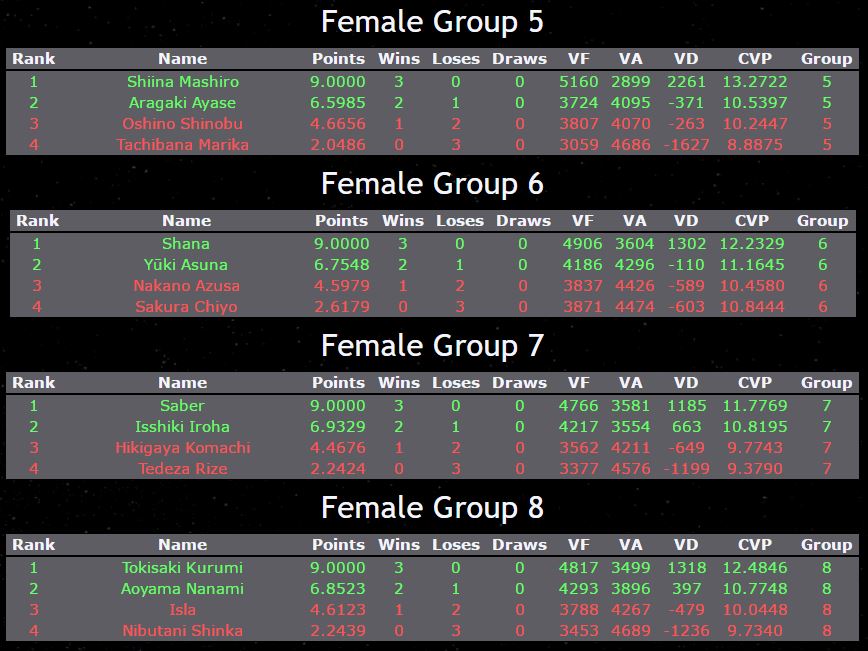 OBS: Embora Shana, Tomori Nao e Yukino Yukinoshita venceram em seus grupos, elas não entram no jogo do colar por terem vencido colares anteriormente, assim passaram as vagas paras as segundas colocadas de melhores campanhas no geral.